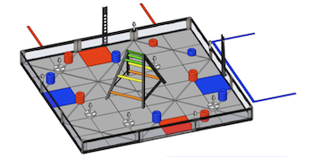 VEX Round Up is played on a 12’x12’ square field. There are a total of forty (40) – twenty (20) red and twenty (20) blue – tubes available as scoring objects in the game. Thirty-six (36) of the tubes will start at designated locations on the field; while two (2) will be available to each alliance prior to the match. Each robot (smaller than 18”x18”x18” to start) begins a match on one of their colored alliance tiles. There are nine goalposts, five of which are attached to movable weighted bases, which teams can score tubes on. Alliances earn extra points for owning a goalpost by scoring more tubes on the goalpost than their opponents. At the center of the field is a 36” high structure known as the ladder that teams can climb or hang off of for additional points. Robots earn different point values for being at least 6” (low hanging) or 18” (high hanging) off the ground.