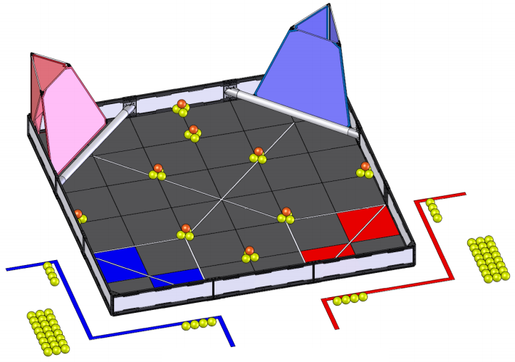 here are ninety-four (94) Balls and ten (10) Bonus Balls, available as Scoring Objects. Some Scoring Objects begin in designated locations on the field, while others are available to be entered into the field during the Match. Each Robot (smaller than 18”x18”x18”) begins a match on one of their Alliance Starting Tiles. Each Alliance has one High Goal and one Low Goal to Score into. Alliances also earn points for Low and High Elevating one of their Robots upon the other. A bonus is awarded to the Alliance that has the most total points at the end of the Autonomous Period.