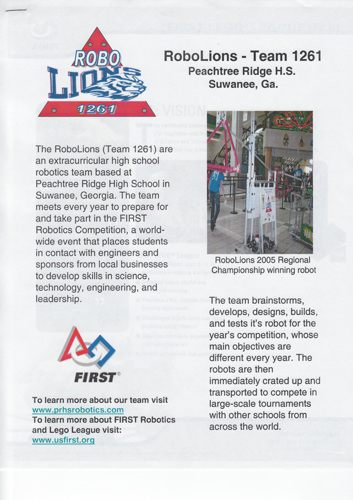 Information sheet about the Robo Lions with picture of the 2005 robot.